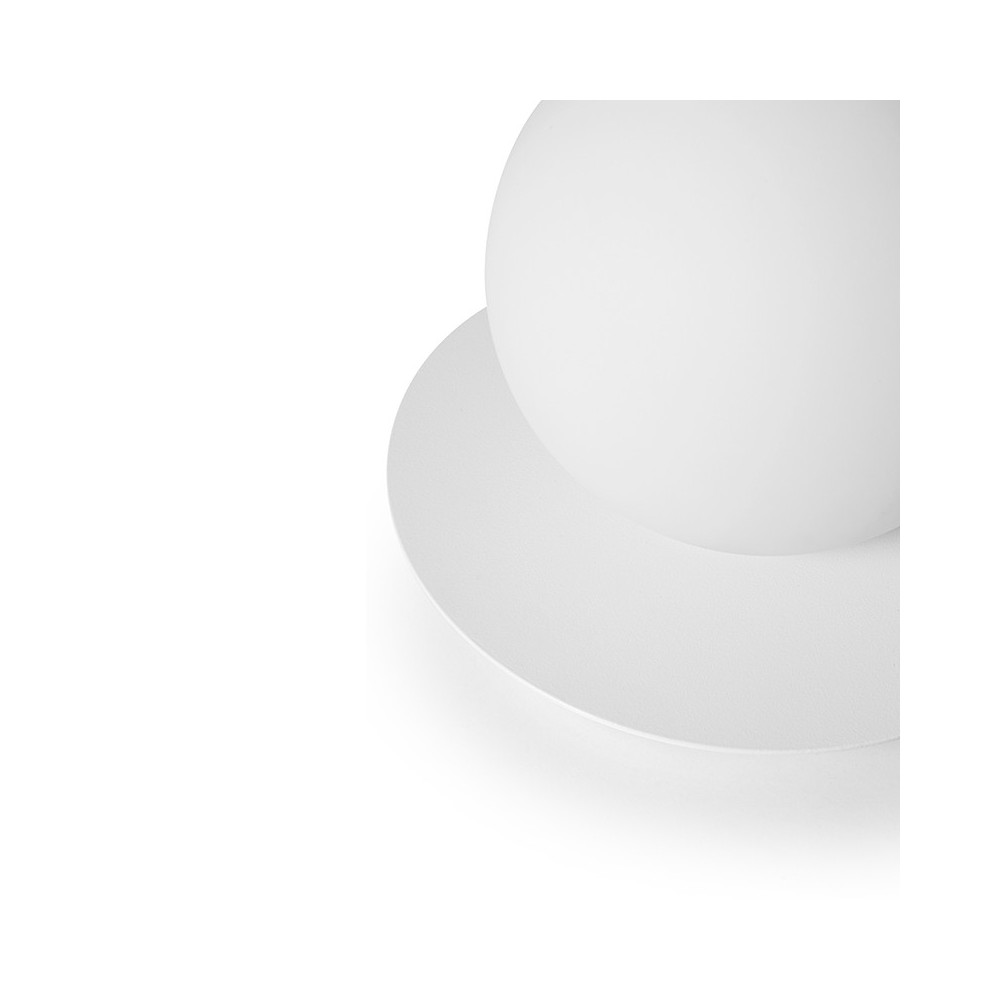La pantalla esférica de color blanco lechoso y 15 cm de diámetro descansa sobre un disco de metal con recubrimiento de polvo, que refleja suavemente la luz y confiere a la lámpara un carácter elegante y lujoso. El conjunto está coronado por una base baja de acabado estructurado, que añade una ligereza gráfica a la lámpara.