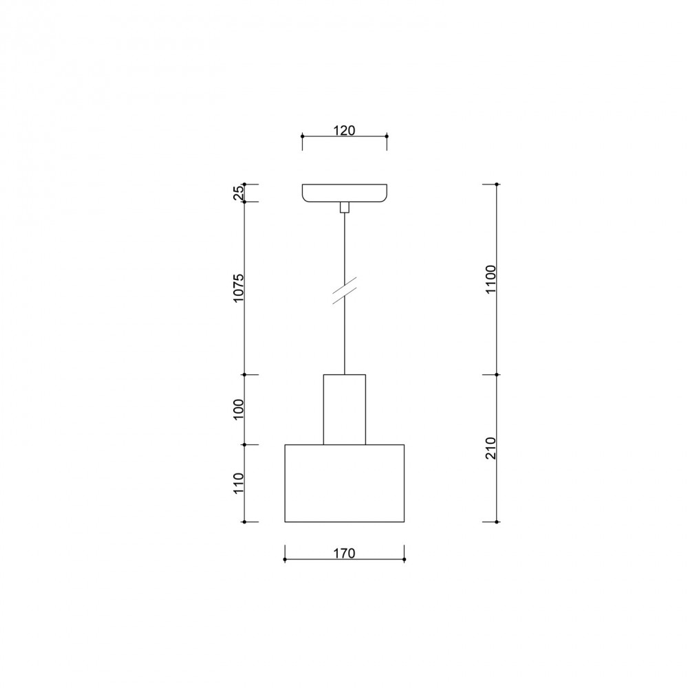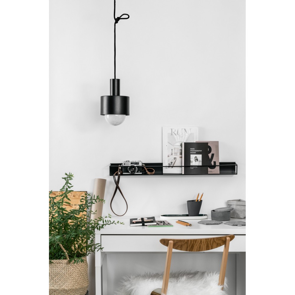 La lámpara está equipada con un cable trenzado textil negro de 107,5 cm de longitud, que permite ajustar libremente la altura de suspensión: desde un voladizo corto y funcional hasta una forma más llamativa suspendida a baja altura sobre la superficie. La forma de la pantalla se ha diseñado para adaptarse a distintos tipos de fuentes de luz. Una bombilla estándar A60 permanece oculta, creando un cuerpo coherente y cerrado, mientras que una bombilla más grande -como una decorativa de 125 mm de diámetro- se extiende más allá de su contorno, cambiando por completo el carácter de la lámpara y añadiendo un toque de diseño.