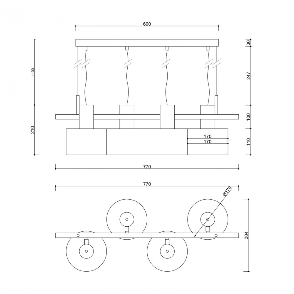 El conjunto se apoya en una barra de techo de 60 cm de largo, que organiza visualmente la composición y confiere a la lámpara un ritmo armonioso. La longitud total de la lámpara es de 131 cm como máximo; gracias a los colgantes regulables, es fácil adaptarla a la altura de la habitación y al efecto de iluminación deseado.