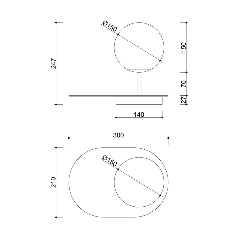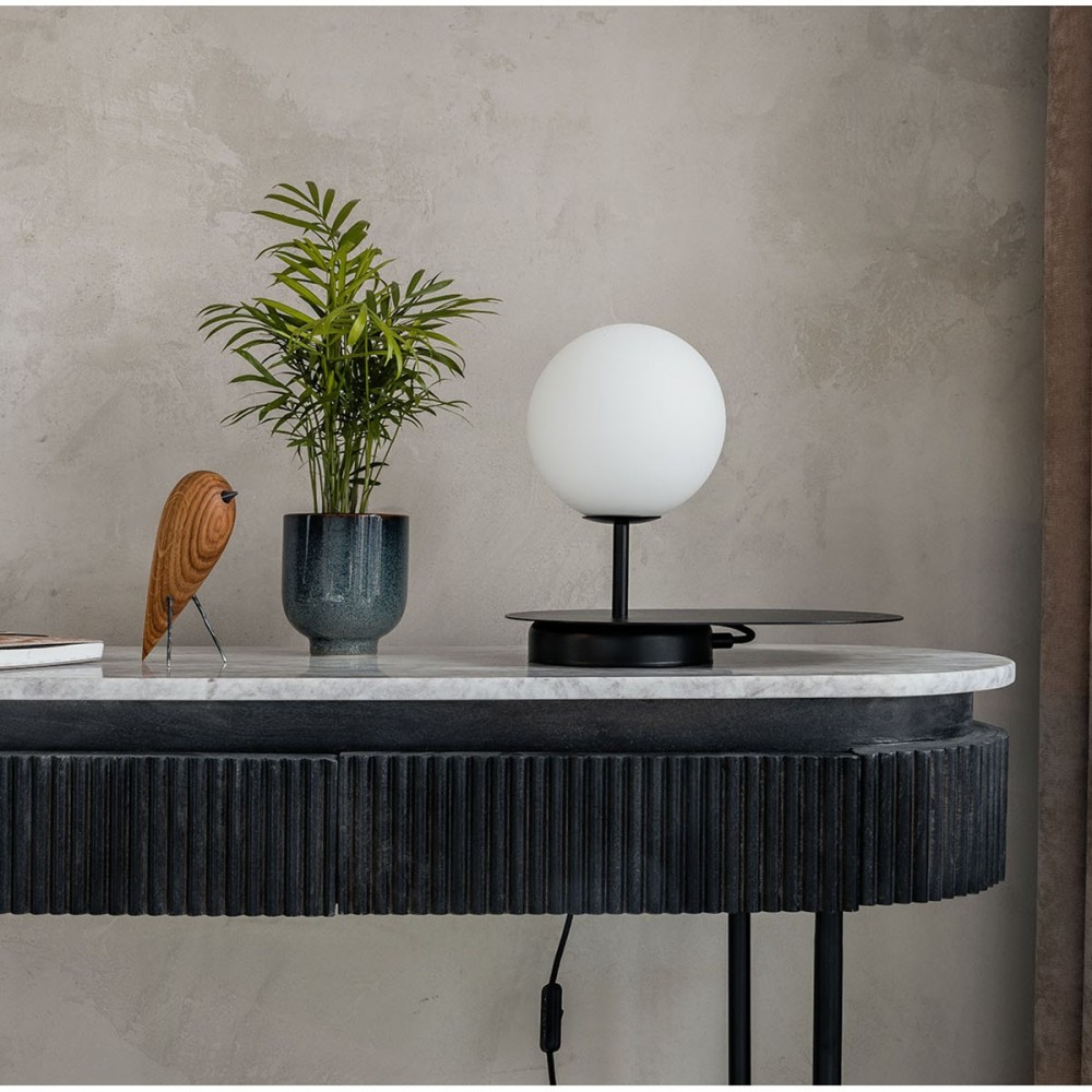 - lámpara de mesa con estante - metal / vidrio - negro - altura 25cm - anchura 30cm - difusor de vidrio blanco mate fi 15cm - base estructural negra fi 14cm - estante de metal negro - 2 X 0.75mm2 cable trenzado de poliéster negro 150cm de largo - enchufe e interruptor negro - rosca G9 - max 12W.