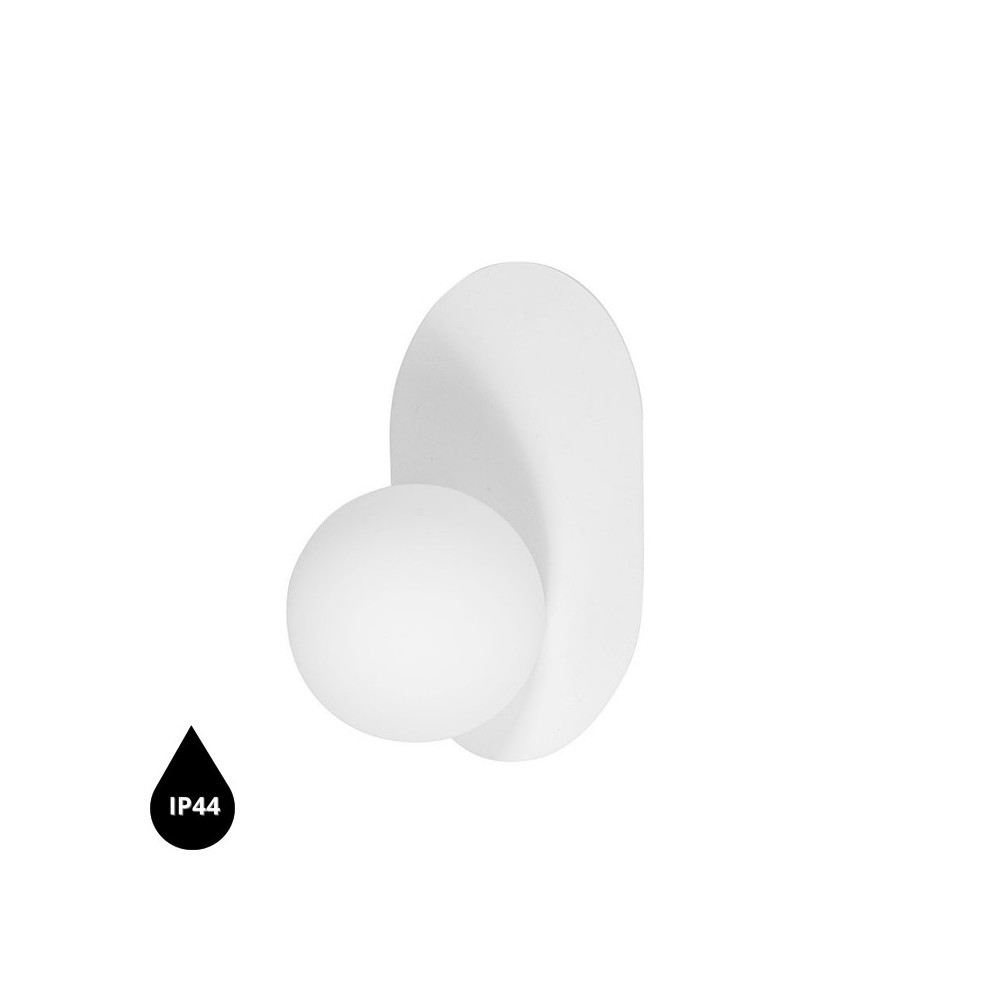 - aplique / soporte de pared - metal / vidrio - blanco / blanco roto - altura 30cm - anchura 21cm - profundidad 18cm - difusor de vidrio 15cm de diámetro en blanco mate - soporte de pared pintado en blanco estructural - cable bifilar 2 X 0,75mm2 - rosca G9 - max 12W - IP44