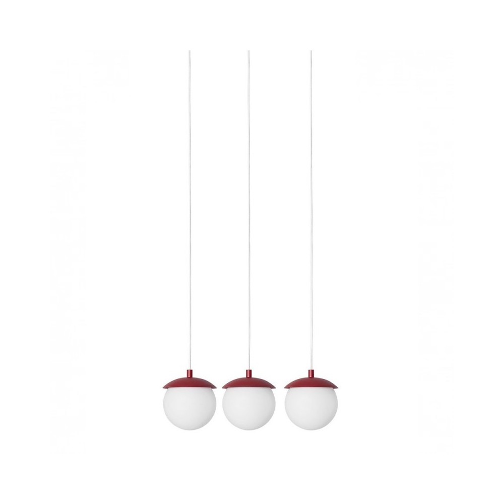 - lámpara de techo, lámpara colgante - color burdeos (Rojo púrpura RAL 3004) - material metal, vidrio - longitud 48,2cm - anchura 15cm - altura 15cm - longitud total 130cm - tres pantallas de vidrio blanco lechoso ⌀15cm - soporte lacado en burdeos estructural - 3x cable de poliéster trenzado blanco 112,5cm - rosca G9 - máx 3x12W LED - IP20.