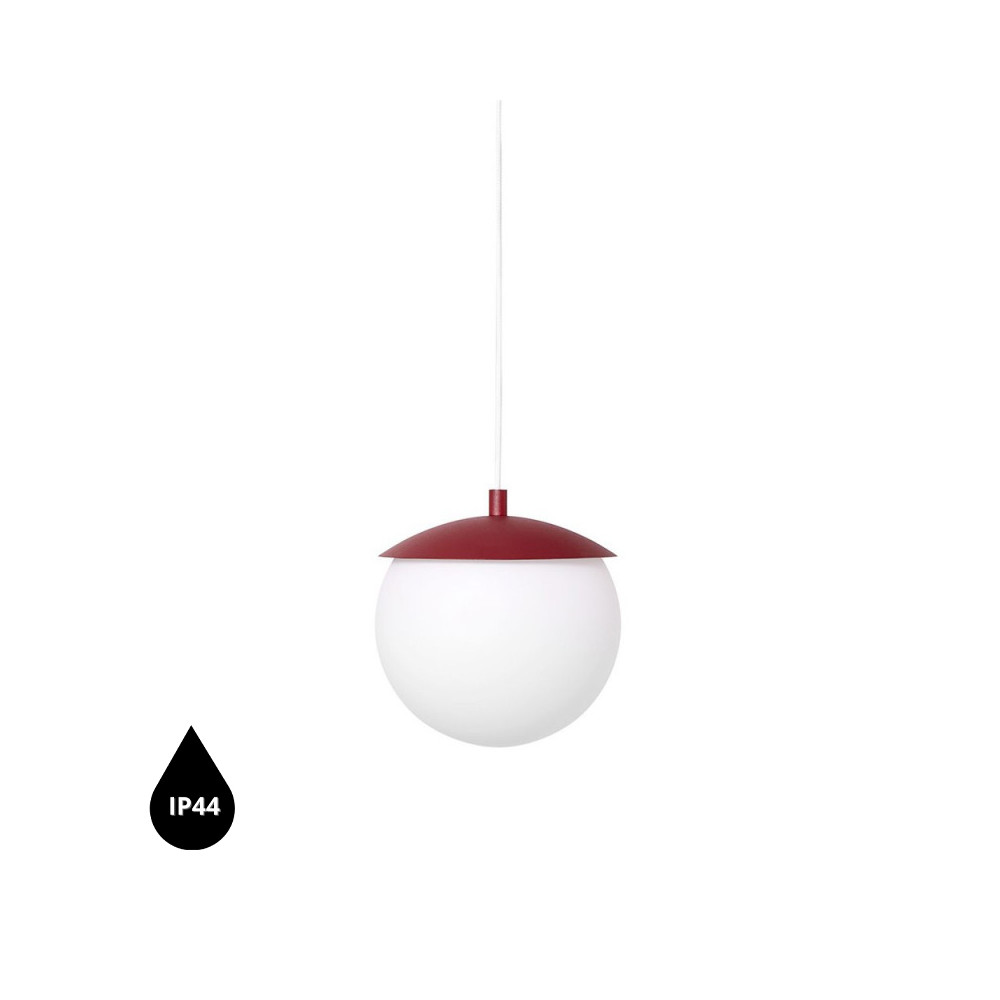 - lámpara de techo, lámpara colgante - color burdeos (Rojo púrpura RAL 9003) - material metal, vidrio - longitud 20cm - anchura 20cm - altura 20cm - longitud total 135cm - difusor de vidrio blanco lechoso ⌀20cm - soporte lacado en burdeos estructural - cable trenzado de poliéster blanco 112,5cm - rosca E27 - LED máx 15W - IP44