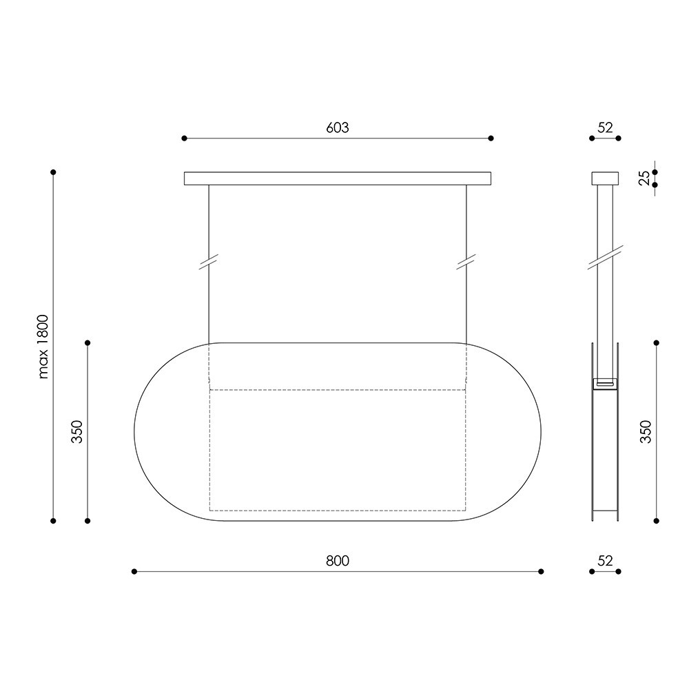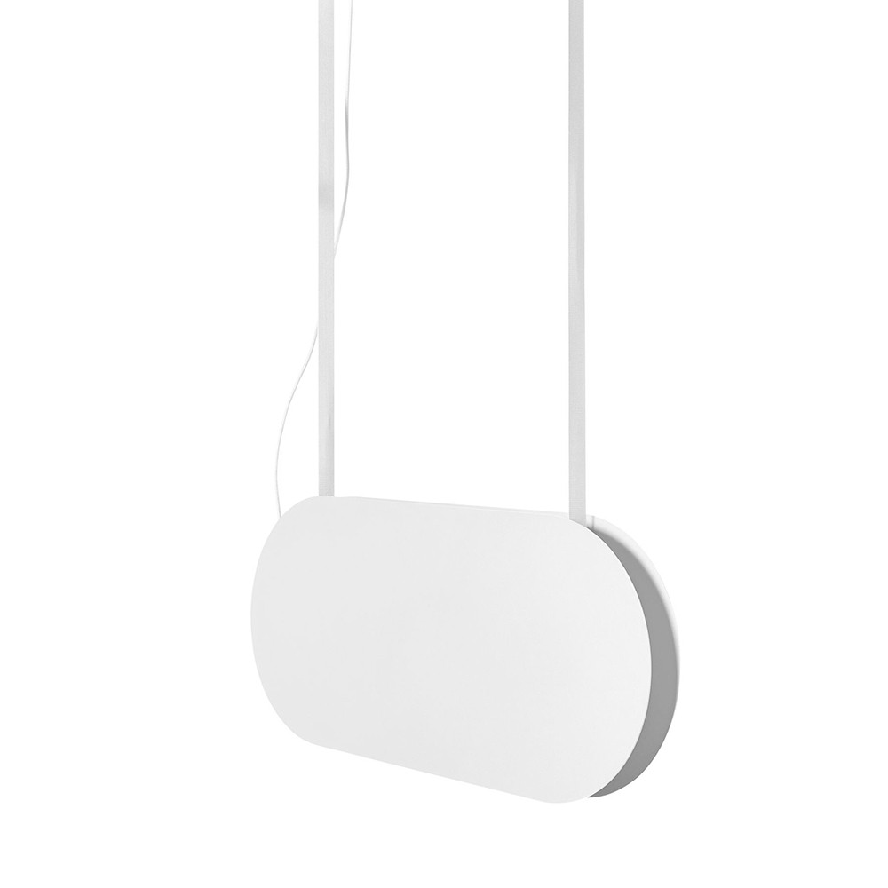 La lámpara está suspendida de una correa textil de color a juego con el cuerpo, de 145 cm de longitud. Su forma horizontal y sus proporciones (80 x 5,2 x 35 cm) hacen que encaje perfectamente sobre una isla de cocina, una barra o una mesa, aportando no sólo luz sino también carácter al espacio.