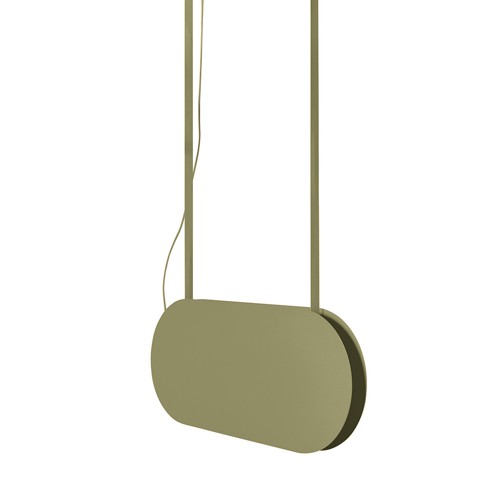 La lámpara está suspendida de una correa textil de color a juego con el cuerpo, de 145 cm de longitud. Su forma horizontal y sus proporciones (80 x 5,2 x 35 cm) hacen que encaje perfectamente sobre una isla de cocina, una barra o una mesa, aportando no sólo luz sino también carácter al espacio.