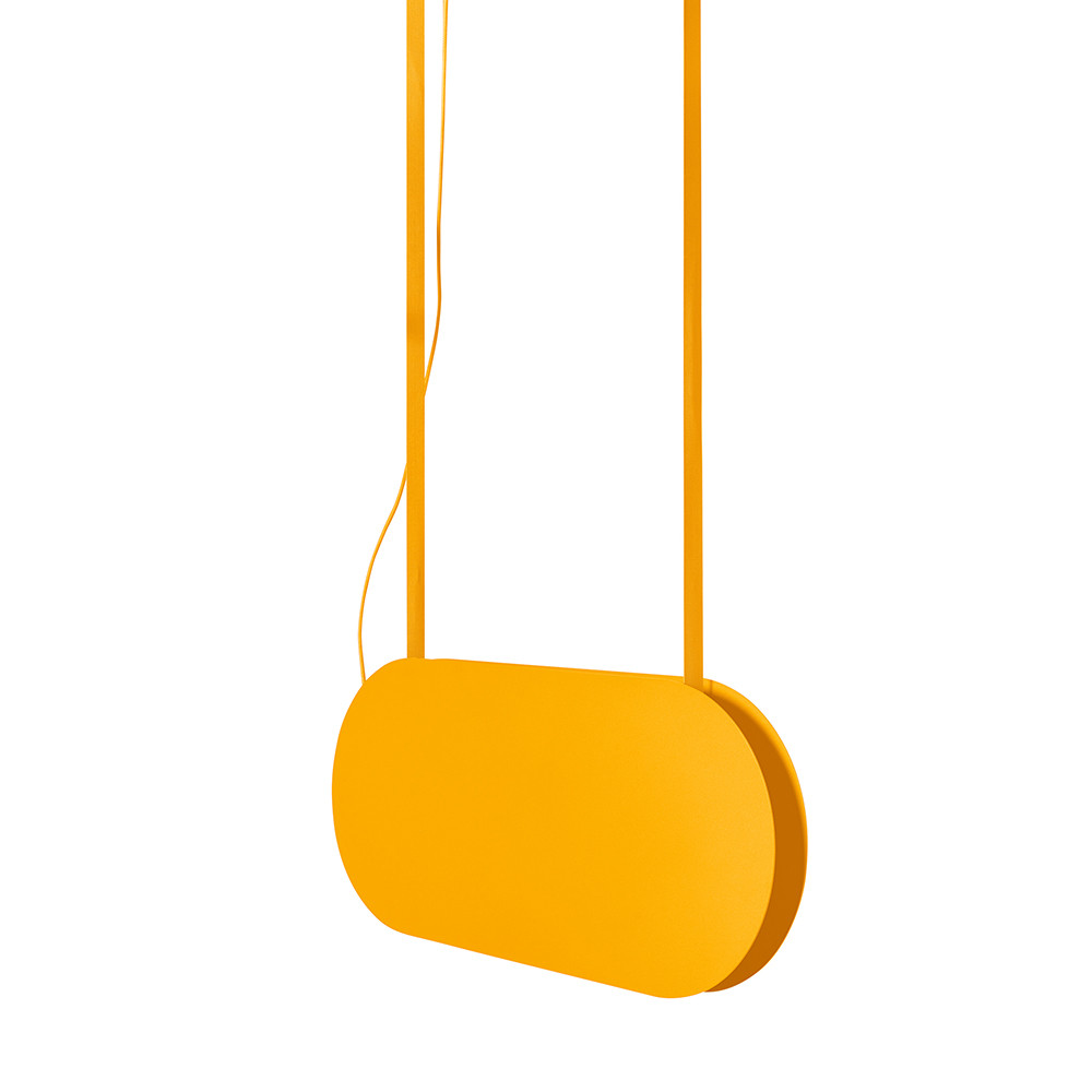 La lámpara está suspendida de una correa textil de color a juego con el cuerpo, de 145 cm de longitud. Su forma horizontal y sus proporciones (80 x 5,2 x 35 cm) hacen que encaje perfectamente sobre una isla de cocina, una barra o una mesa, aportando no sólo luz sino también carácter al espacio.