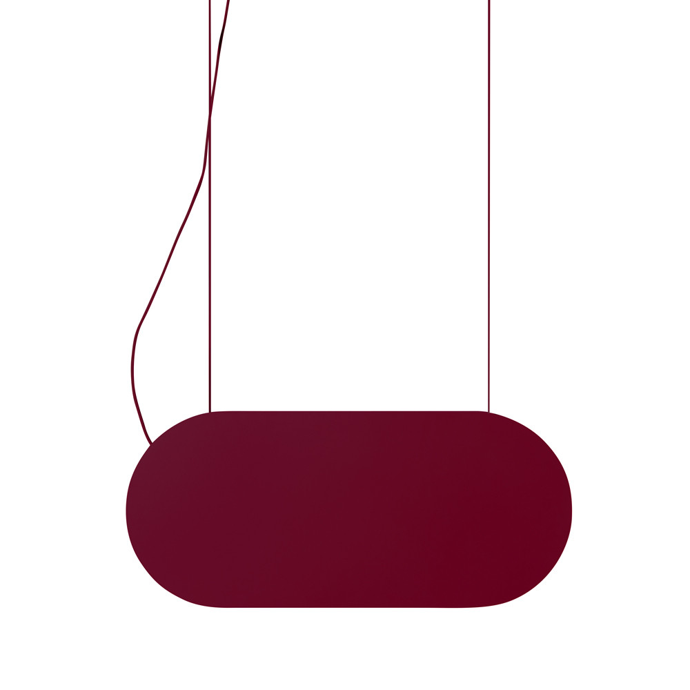 La lámpara está suspendida de una correa textil de color a juego con el cuerpo, de 145 cm de longitud. Su forma horizontal y sus proporciones (80 x 5,2 x 35 cm) hacen que encaje perfectamente sobre una isla de cocina, una barra o una mesa, aportando no sólo luz sino también carácter al espacio.