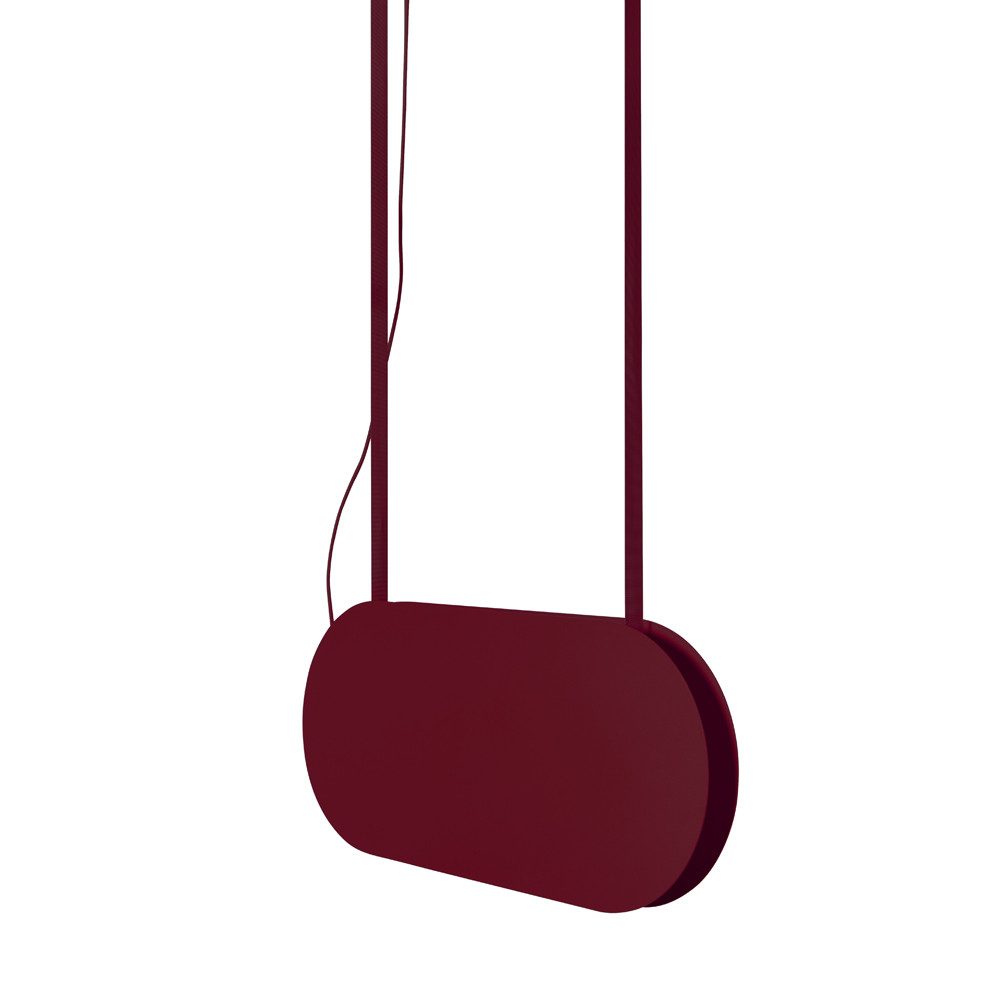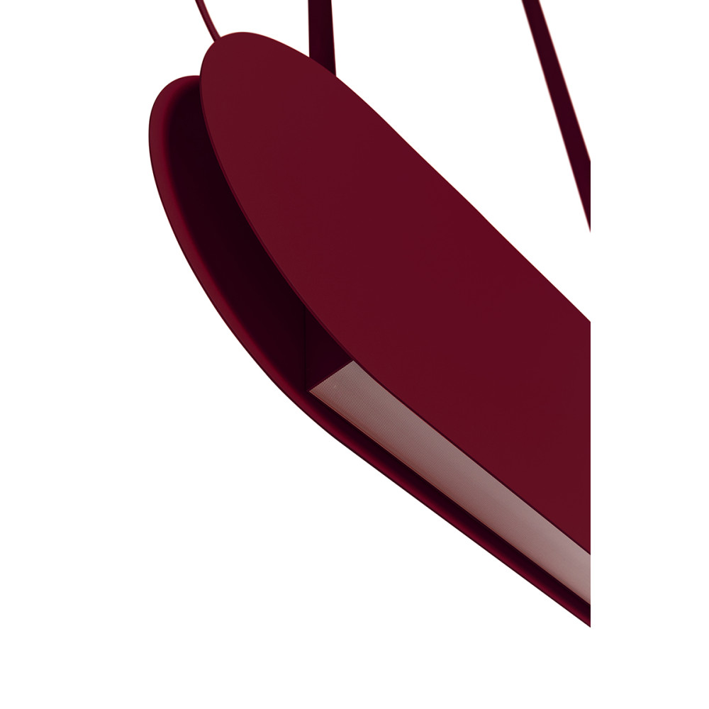 - lámpara de techo, lámpara colgante - color burdeos (Rojo púrpura RAL 3004) - material metal, aluminio - longitud 80cm - anchura 5,2cm - altura 35cm - longitud total 180cm - cable trenzado de poliéster 145cm - 2x cinta de tela 145cm - cubierta de techo de metal burdeos 60,3cm - LED incorporado - potencia 24W - IP20