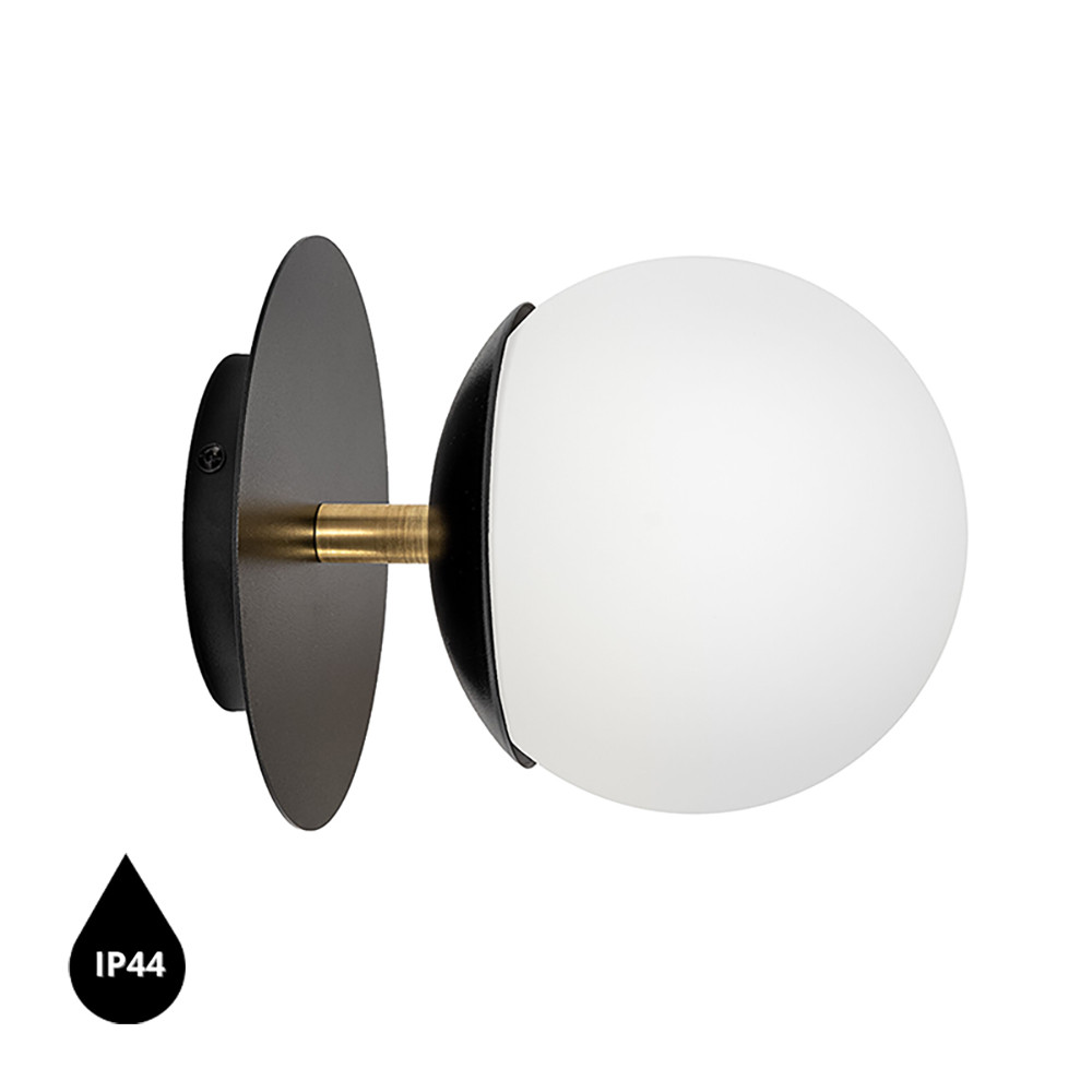 - aplique / soporte de pared / plafón - metal / latón / vidrio - negro / dorado / blanco - altura 20cm - profundidad 27cm - diámetro 20cm - difusor de vidrio blanco mate fi 20cm - soporte de pared estructural lacado negro fi 14cm - disco de metal fi 20cm - cable bifilar 2 X 0,75mm2 - rosca E27 - max 15W
