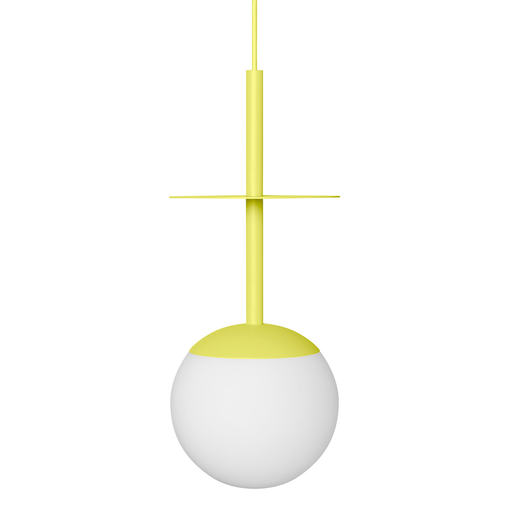 - lámpara de techo, lámpara colgante - material metal, vidrio - color amarillo (Amarillo Azufre RAL 1016) - longitud 160cm - longitud del cable 110cm - difusor de vidrio blanco mate fi 20cm - rejilla de techo pintada amarillo estructural fi 12cm - disco de metal fi 20cm - cable bifilar 2 X 0,75mm2 en trenza de poliéster amarillo - rosca E27 - max 15W - IP20
