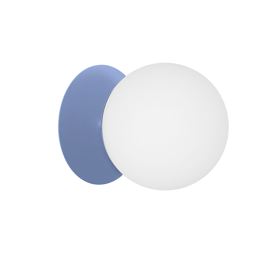 -aplique, soporte de pared, plafón - material metal, vidrio - color azul (Pigeon Blue RAL 5014) - largo 26,6cm - ancho 20cm - alto 20cm - difusor de vidrio blanco mate fi 20cm - soporte de pared lacado azul estructural fi 14cm - disco de metal fi 20cm - cable bifilar 2 X 0,75mm2 - rosca E27 - máx 15W - IP44