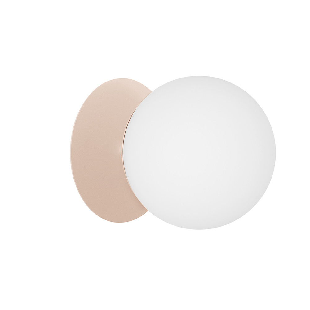 - aplique, soporte de pared, plafón - material metal, vidrio - color beige (Soft Peach) - largo 26,6cm - ancho 20cm - alto 20cm - difusor de vidrio blanco esmerilado fi 20cm - soporte de pared estructural lacado beige fi 14cm - disco de metal fi 20cm - cable bifilar 2 X 0,75mm2 - rosca E27 - máx 15W - IP44