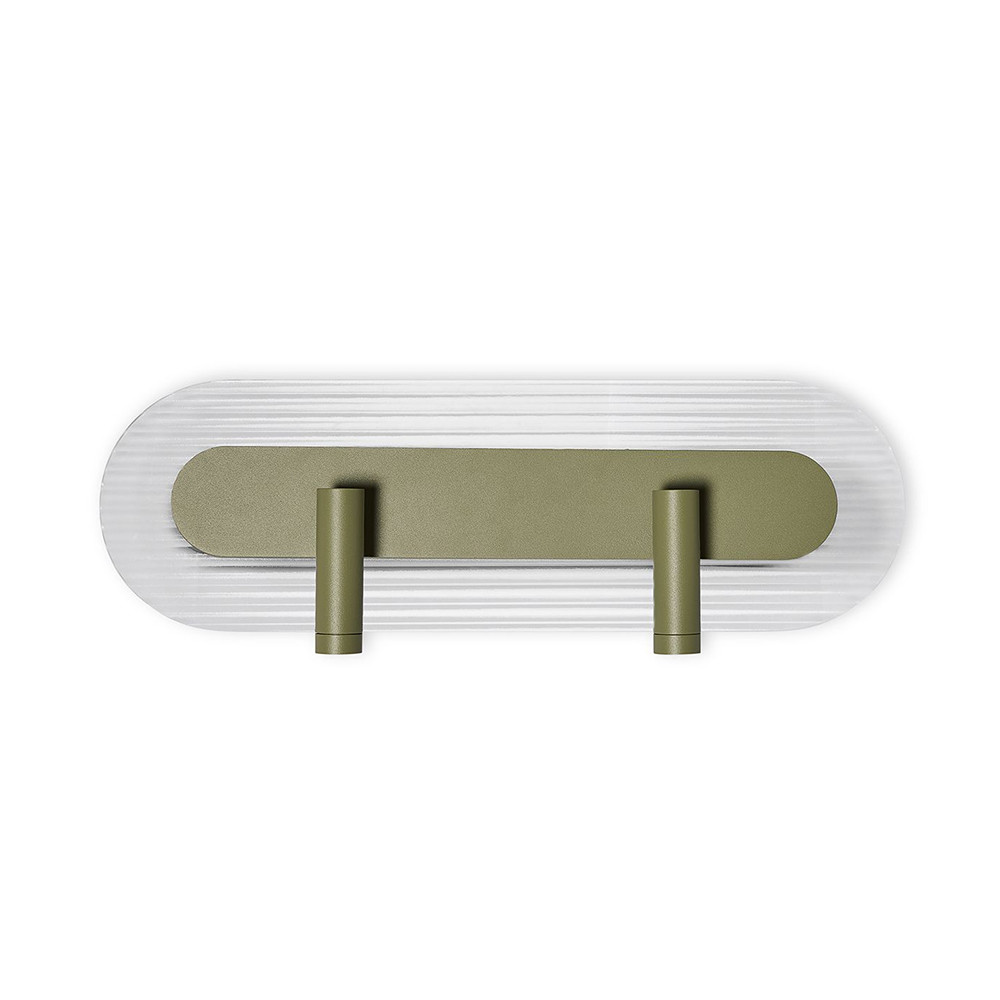 - aplique, aplique de pared - color verde oliva (Reed Green RAL 6013) - material metal, vidrio - longitud 4,3cm - anchura 48,8cm - altura 15,6cm - difusor de vidrio ondulado con elemento decorativo oliva - 2x foco regulable 2,1W - cubierta de metal verde oliva 39,8cm x 6,8cm - LED incorporado - potencia 4,8W - IP20