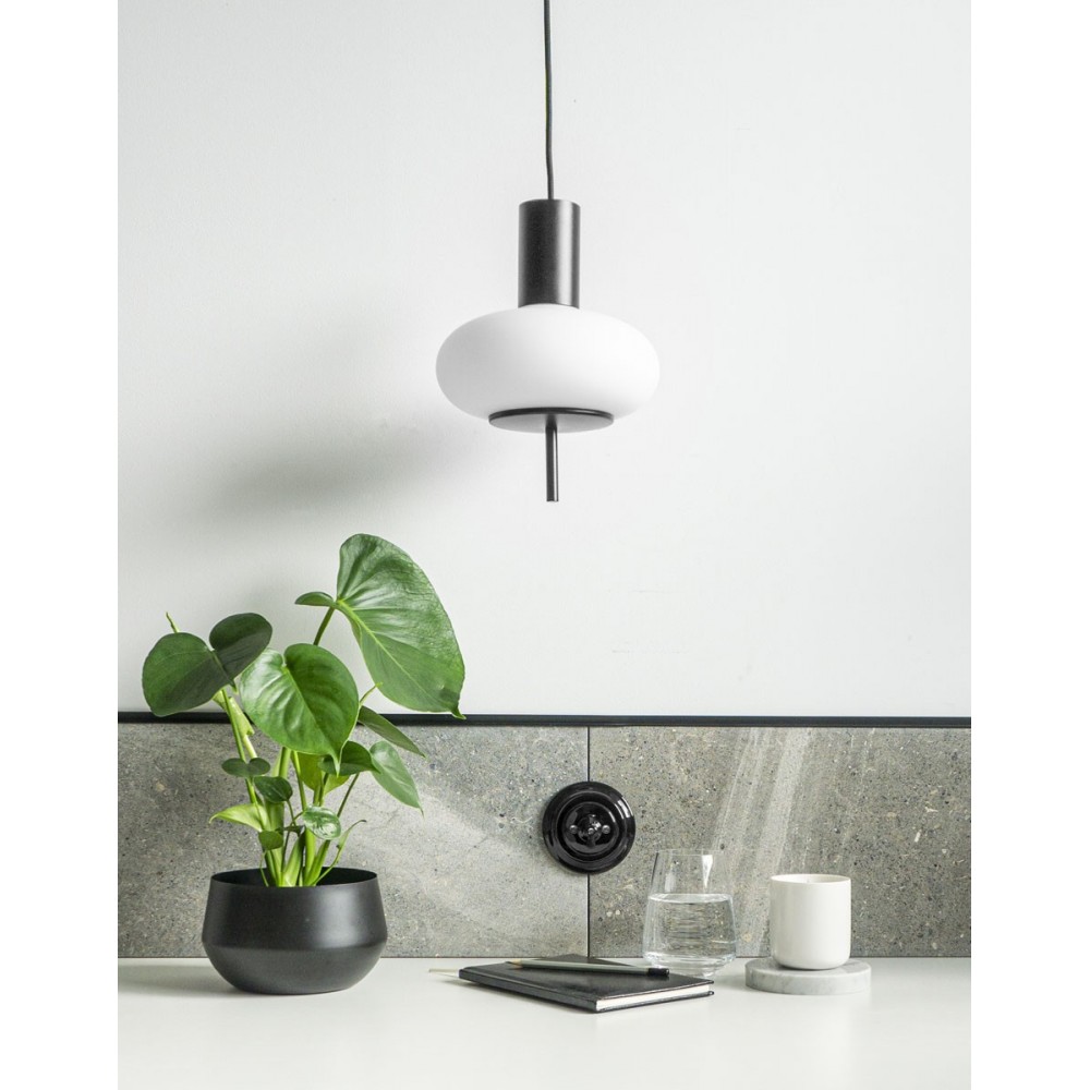 - lámpara de techo / colgante - metal / vidrio - negro / blanco - longitud total 130cm - diámetro 22cm - difusor de vidrio blanco mate fi 22cm - bisel estructural lacado negro fi 12cm - 100cm de largo 2 X 0,75mm2 cable bifilar en trenza de poliéster negro - rosca E27 - max 15W